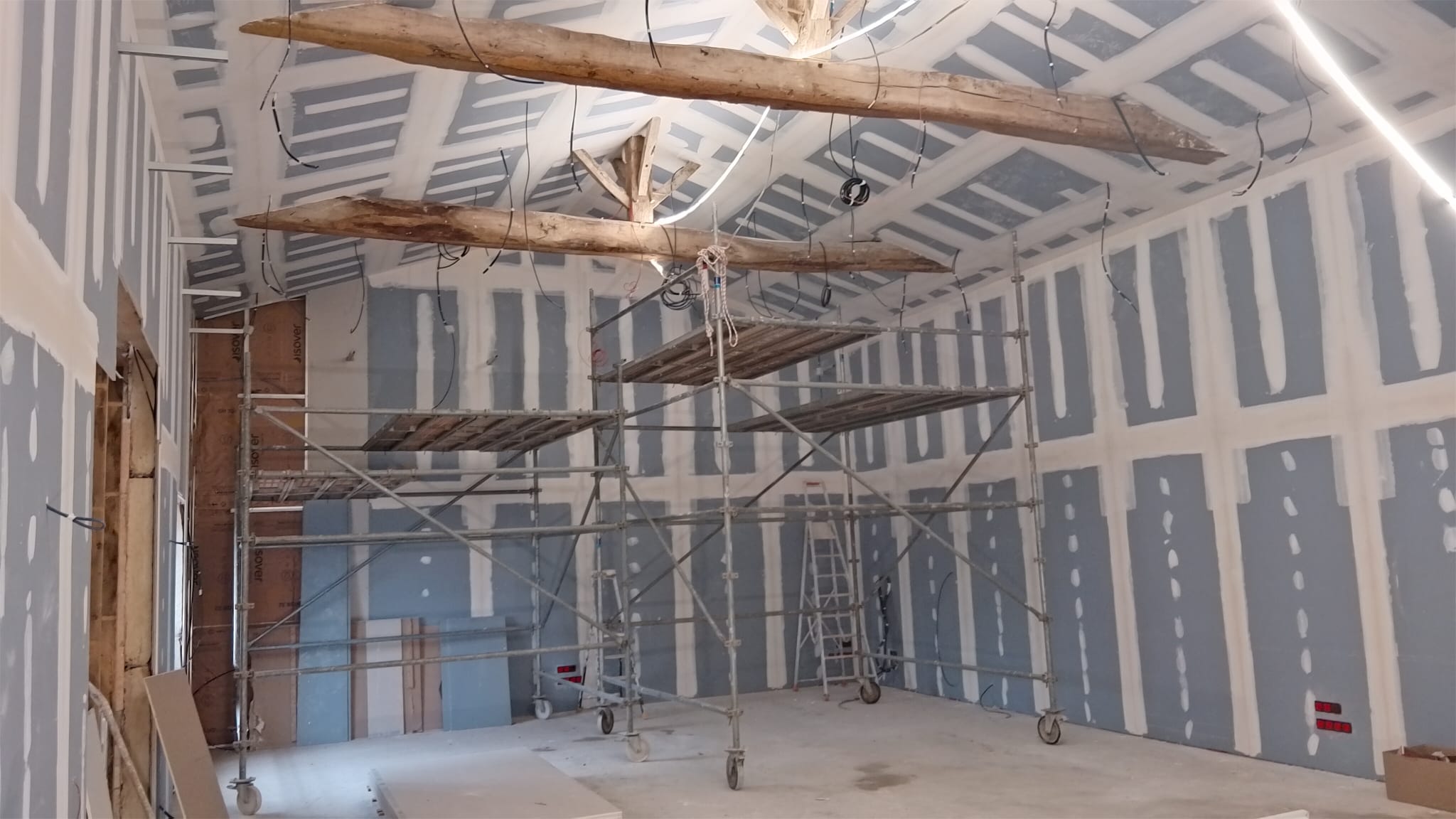 Cette belle pièce de 105m2 avec une hauteur sous plafond de 6 mètres se pare de nouvelles couleurs. Encore un peu de patience...